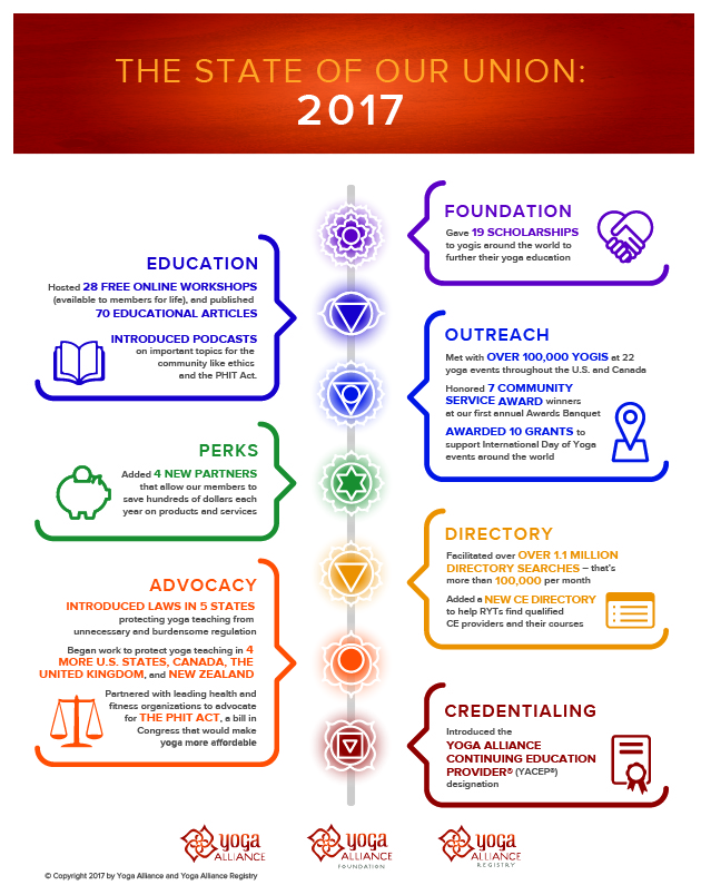As we enter 2017, we mark another year of remarkable growth for the yoga community. Today, we’re releasing our 2017 State of Our Union—our annual report that summarizes all of the progress and key accomplishments we’ve made over the past year. This year, our State of Our Union has a new format! It's a single, simple infographic which you can download, print, and share with your yoga community.